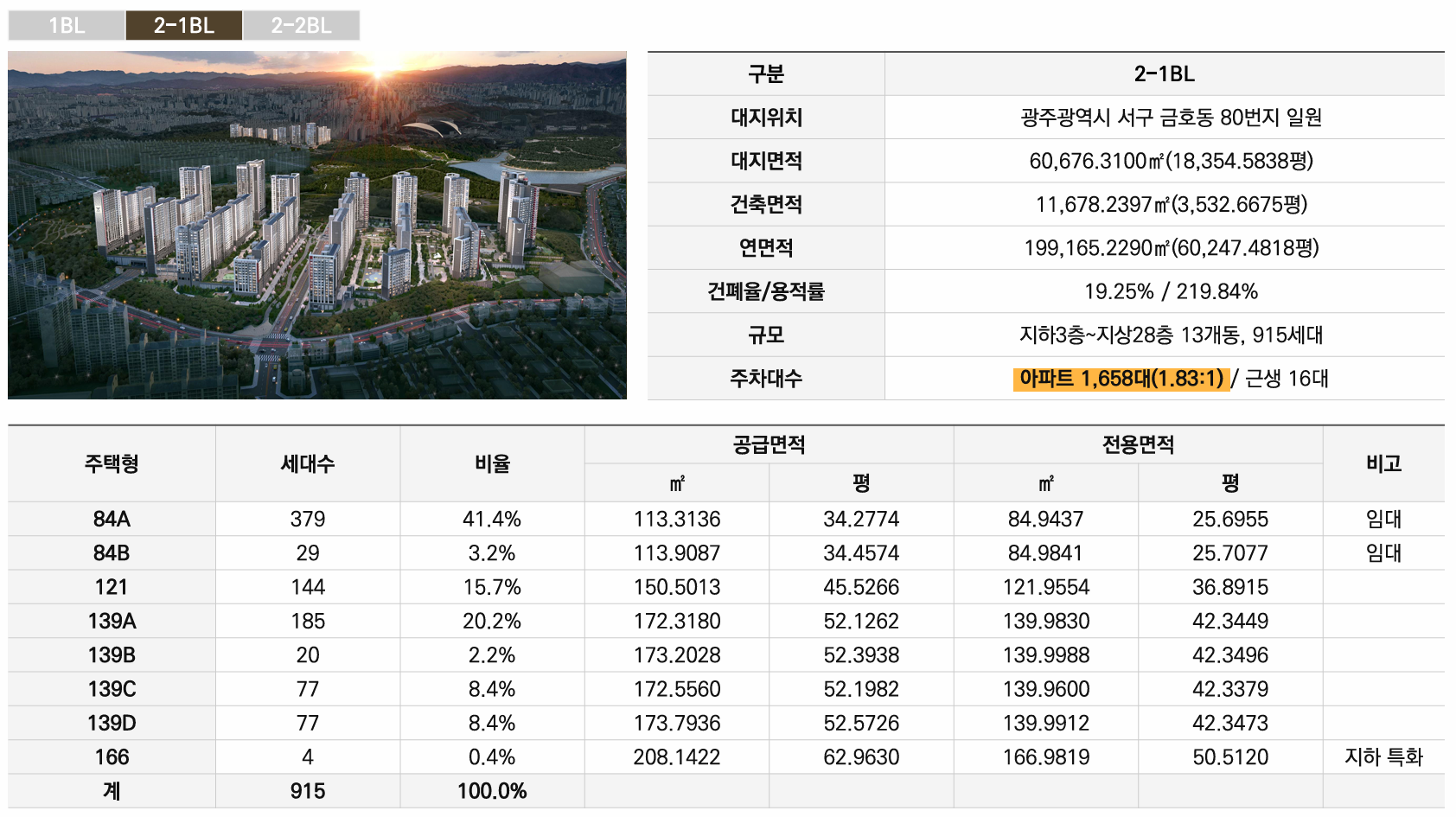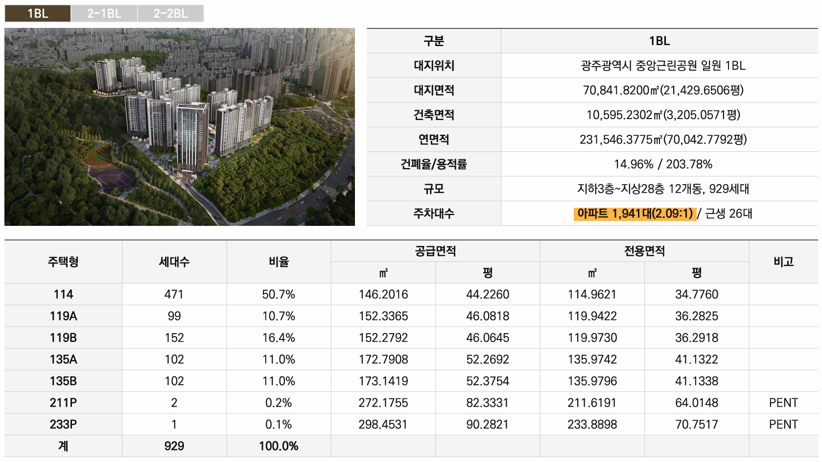 A. 세대당 평균 1.94:1로 매우 여유롭습니다. 1블록 2.09:1, 2-1블록 1.83:1, 2-2블록 1.89:1로 모두 세대당 1.8대 이상 확보되어 있습니다. 대부분 지하주차장으로 지상은 보행자 중심 공간이며, 근린생활시설 주차장도 별도 분리되어 있습니다.