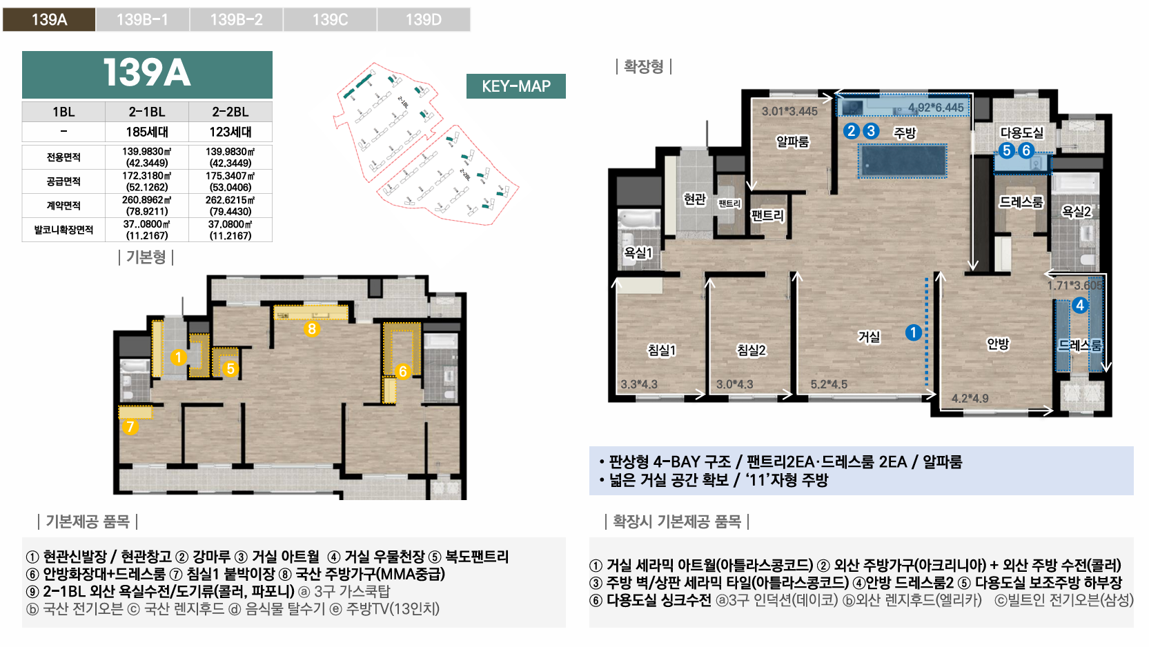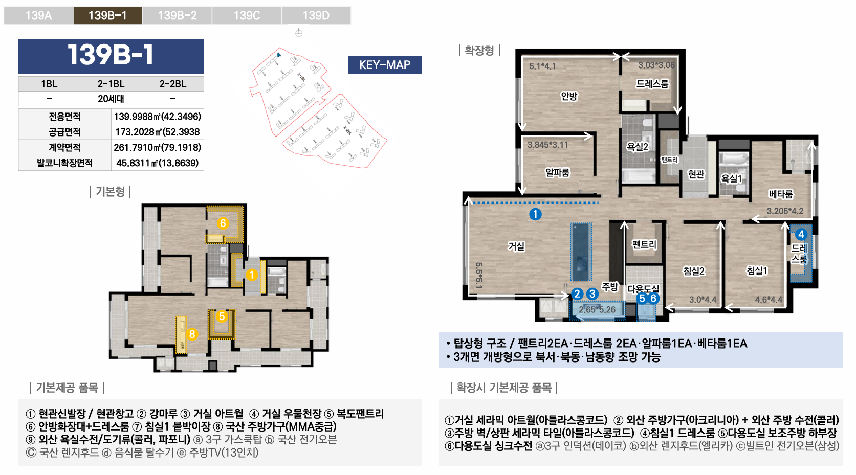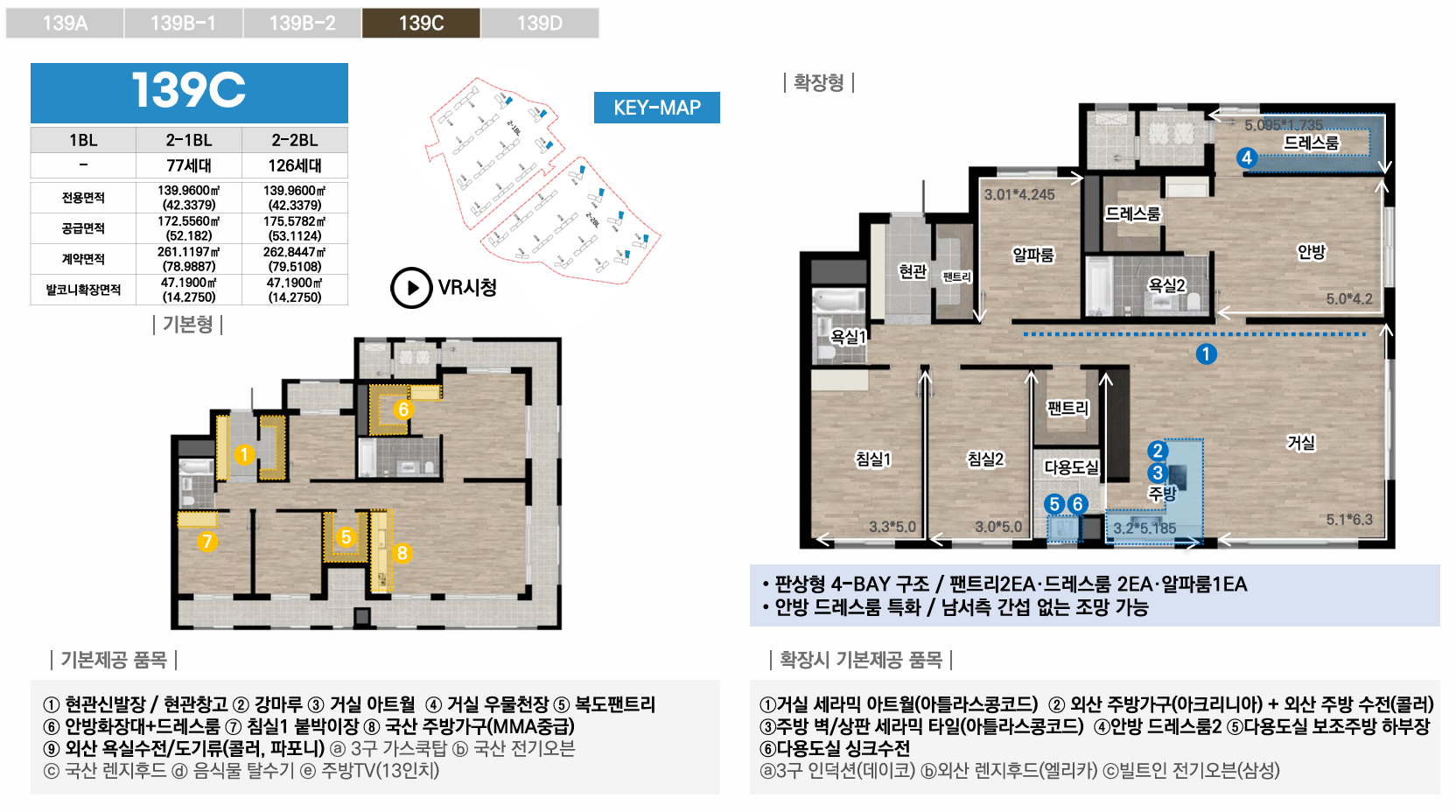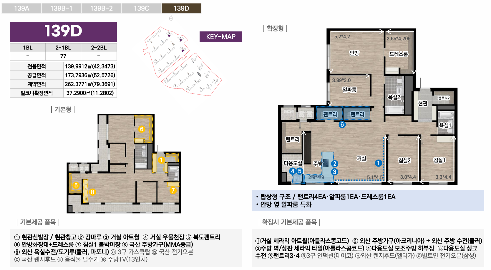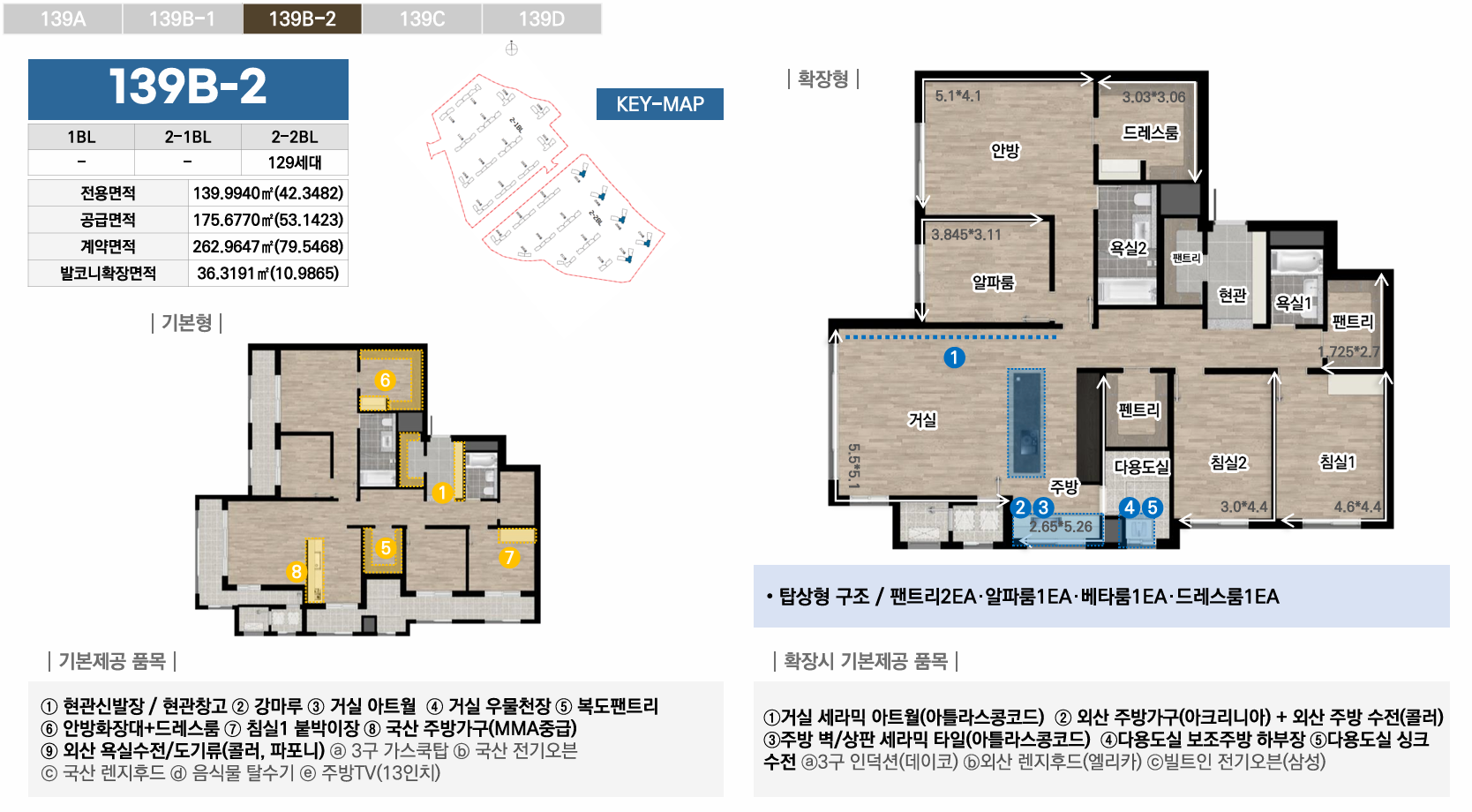 1블록은 중대형 선호층을 위한 44평 이상 특화, 2-1블록은 임대와 다양한 139타입으로 선택폭 극대화, 2-2블록은 국민평수부터 대형까지 가장 균형잡힌 구성으로 각 블록마다 차별화된 평면 전략을 통해 다양한 수요층을 만족시킵니다. 모든 타입에 발코니 확장이 가능하며, 시스템에어컨·빌트인 가전 등 프리미엄 유상옵션도 선택할 수 있어 입주민의 라이프스타일에 맞춰 맞춤형 주거공간을 완성할 수 있습니다.