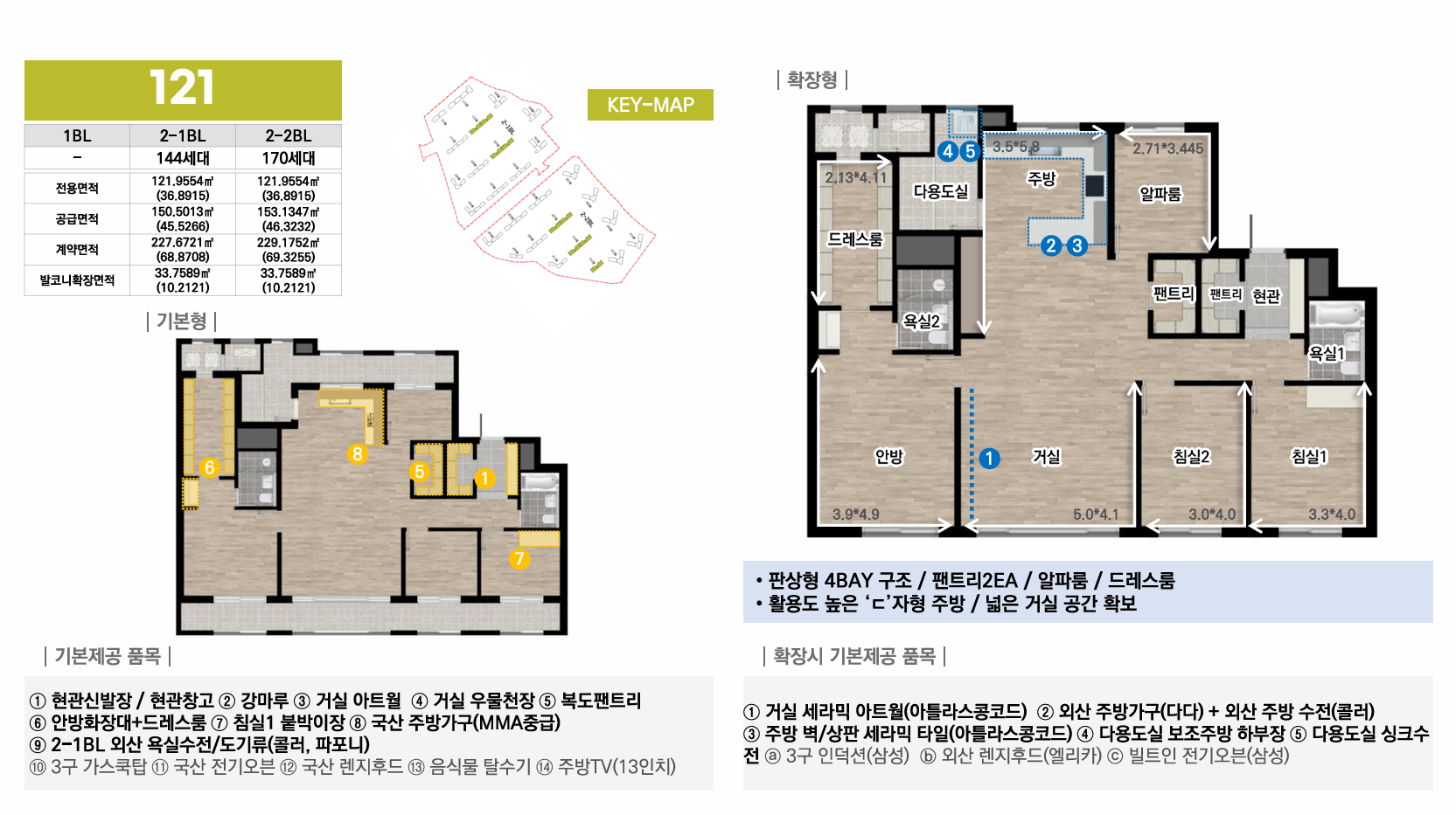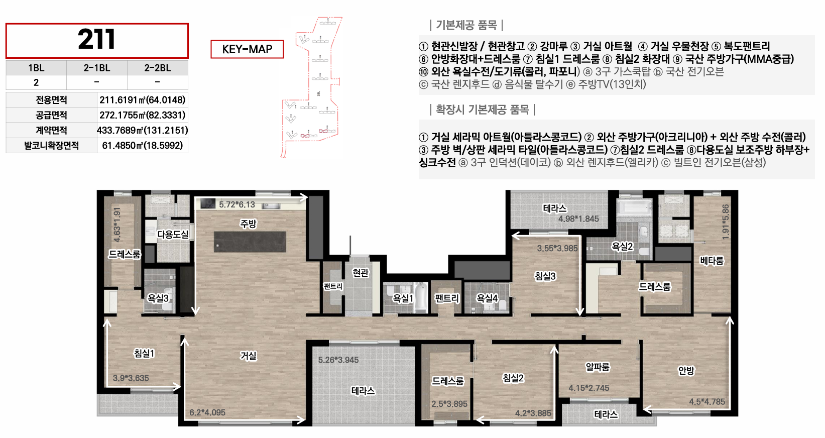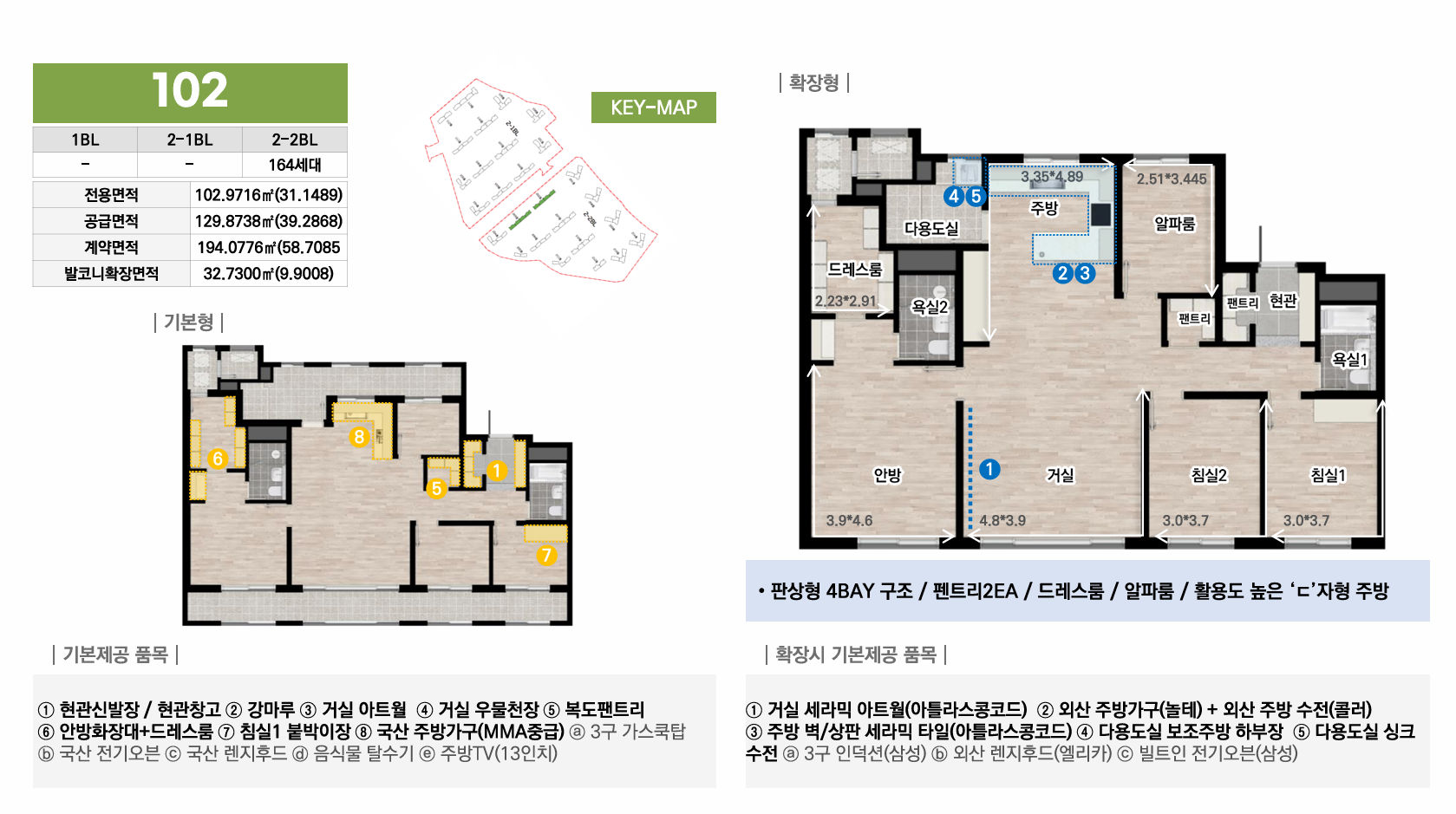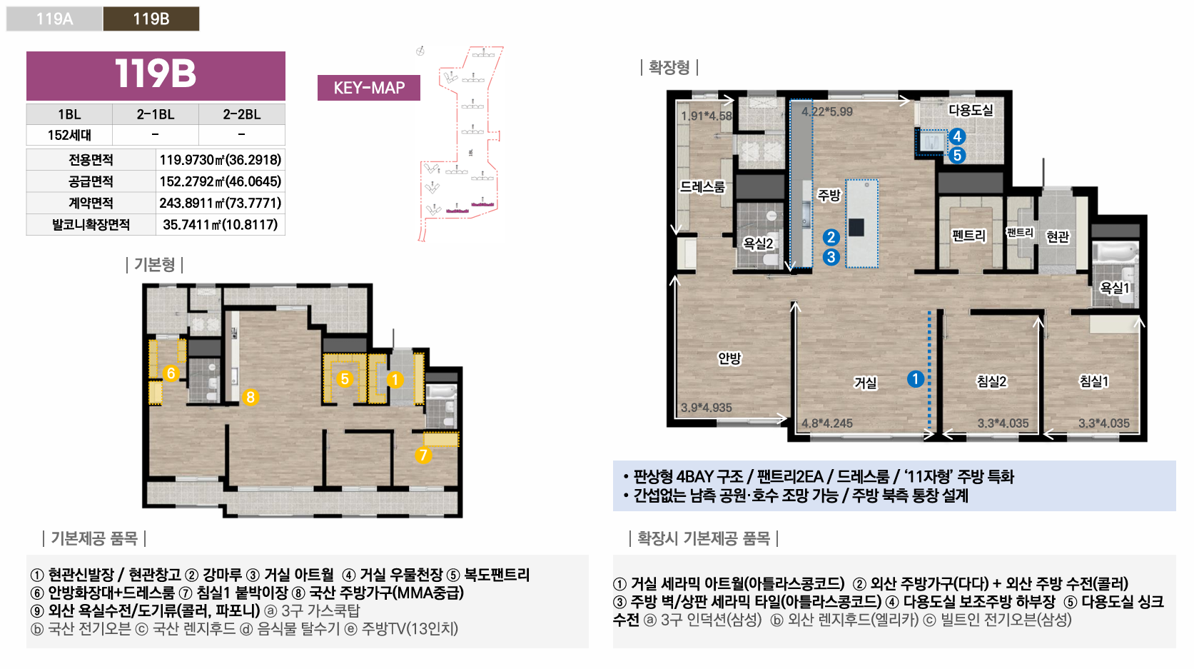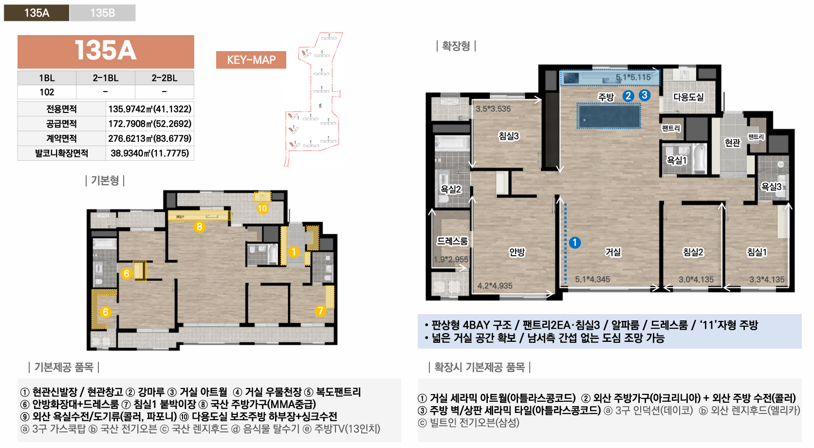 1블록은 중대형 선호층을 위한 44평 이상 특화, 2-1블록은 임대와 다양한 139타입으로 선택폭 극대화, 2-2블록은 국민평수부터 대형까지 가장 균형잡힌 구성으로 각 블록마다 차별화된 평면 전략을 통해 다양한 수요층을 만족시킵니다. 모든 타입에 발코니 확장이 가능하며, 시스템에어컨·빌트인 가전 등 프리미엄 유상옵션도 선택할 수 있어 입주민의 라이프스타일에 맞춰 맞춤형 주거공간을 완성할 수 있습니다.