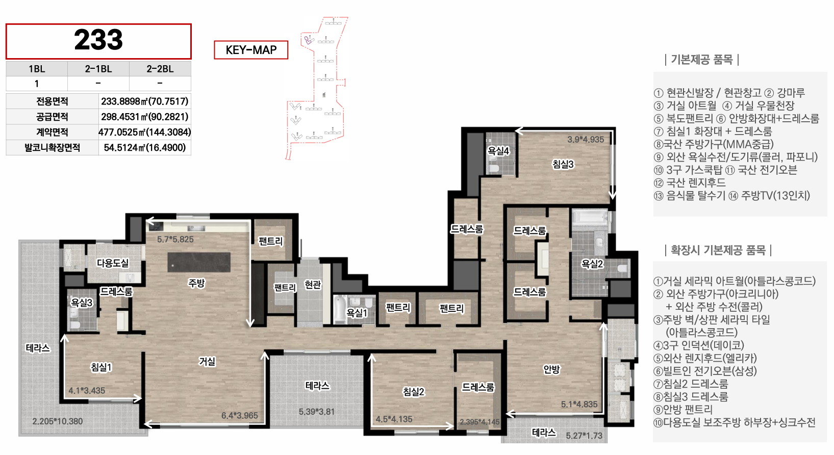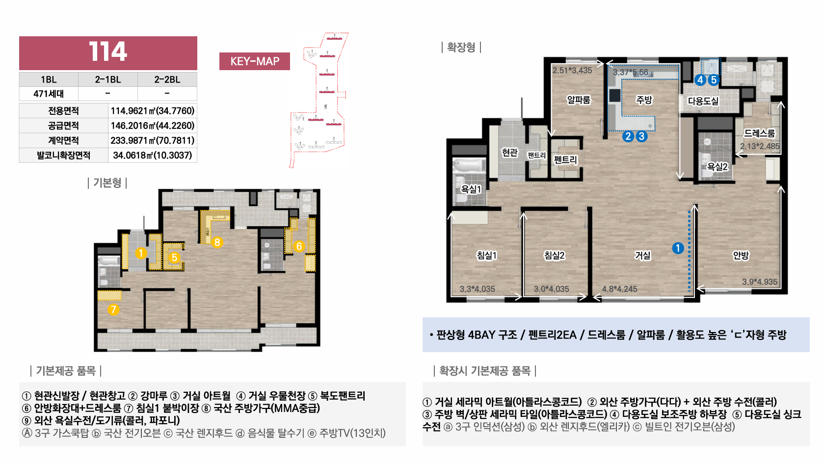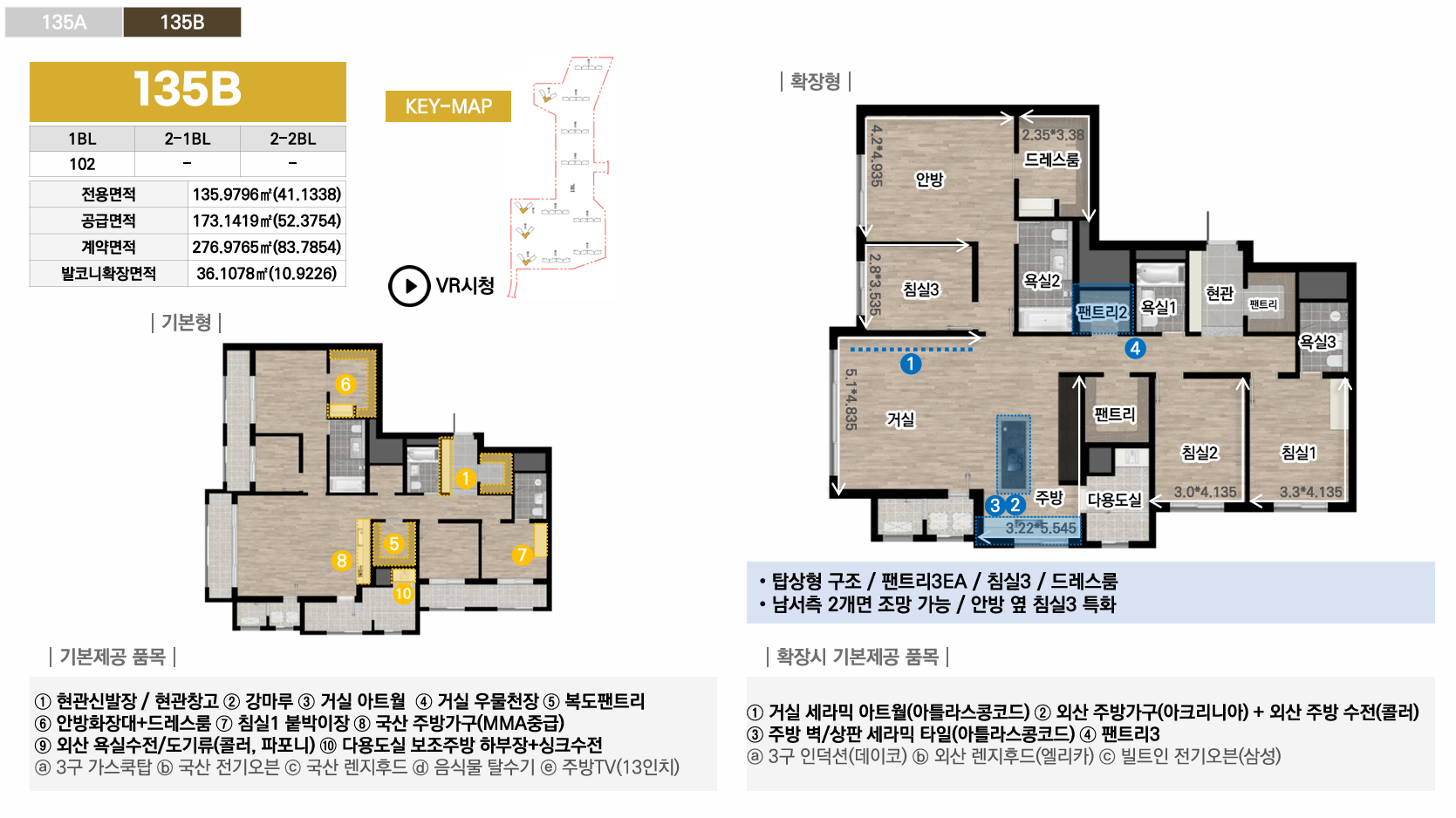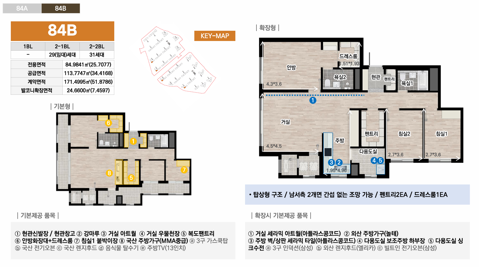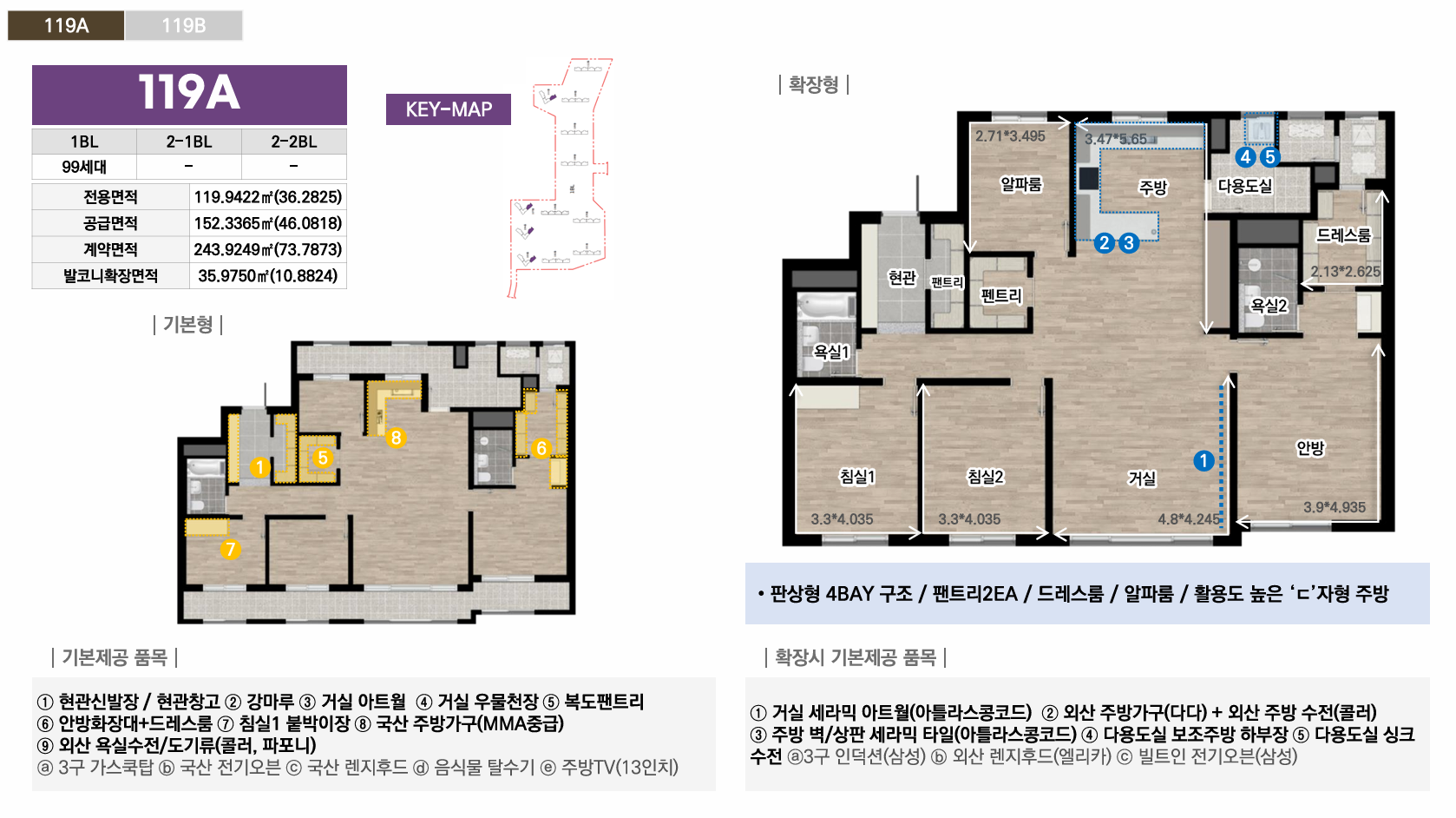 1블록은 중대형 선호층을 위한 44평 이상 특화, 2-1블록은 임대와 다양한 139타입으로 선택폭 극대화, 2-2블록은 국민평수부터 대형까지 가장 균형잡힌 구성으로 각 블록마다 차별화된 평면 전략을 통해 다양한 수요층을 만족시킵니다. 모든 타입에 발코니 확장이 가능하며, 시스템에어컨·빌트인 가전 등 프리미엄 유상옵션도 선택할 수 있어 입주민의 라이프스타일에 맞춰 맞춤형 주거공간을 완성할 수 있습니다.